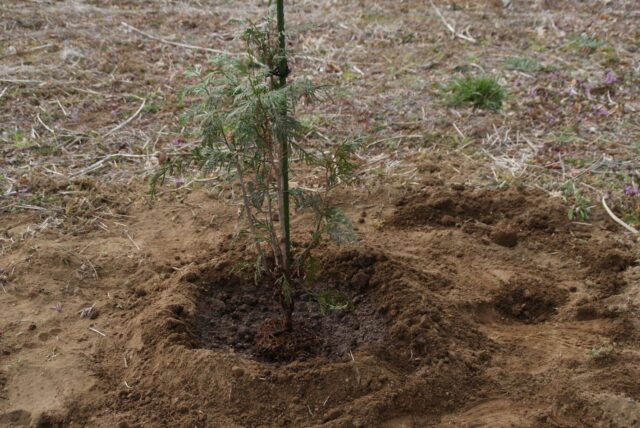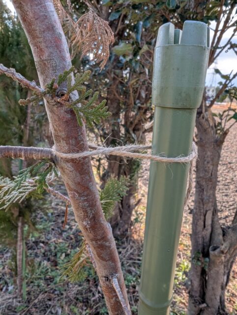 樹木苗の植え付け後、支柱を立ててそこに誘引固定すると活着が良くなる。