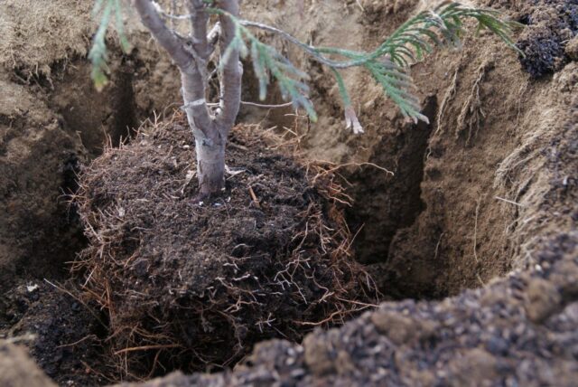 街路樹の苗を植え付ける際、乾燥を防ぐため深植えすると良い。