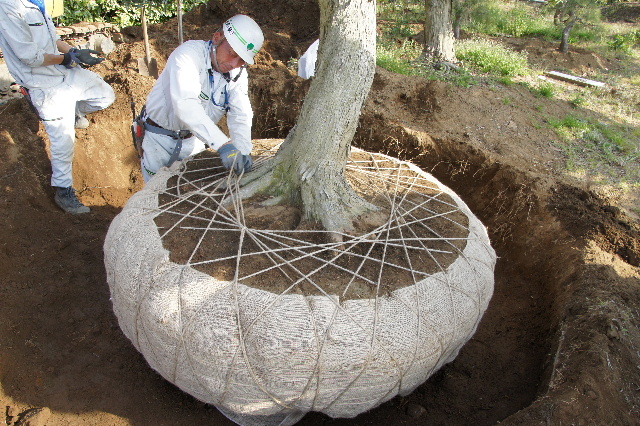 根部をコモで巻いた根巻き苗を植え付ける際、巻いてあるコモを慎重に剥いでから植え付ける。