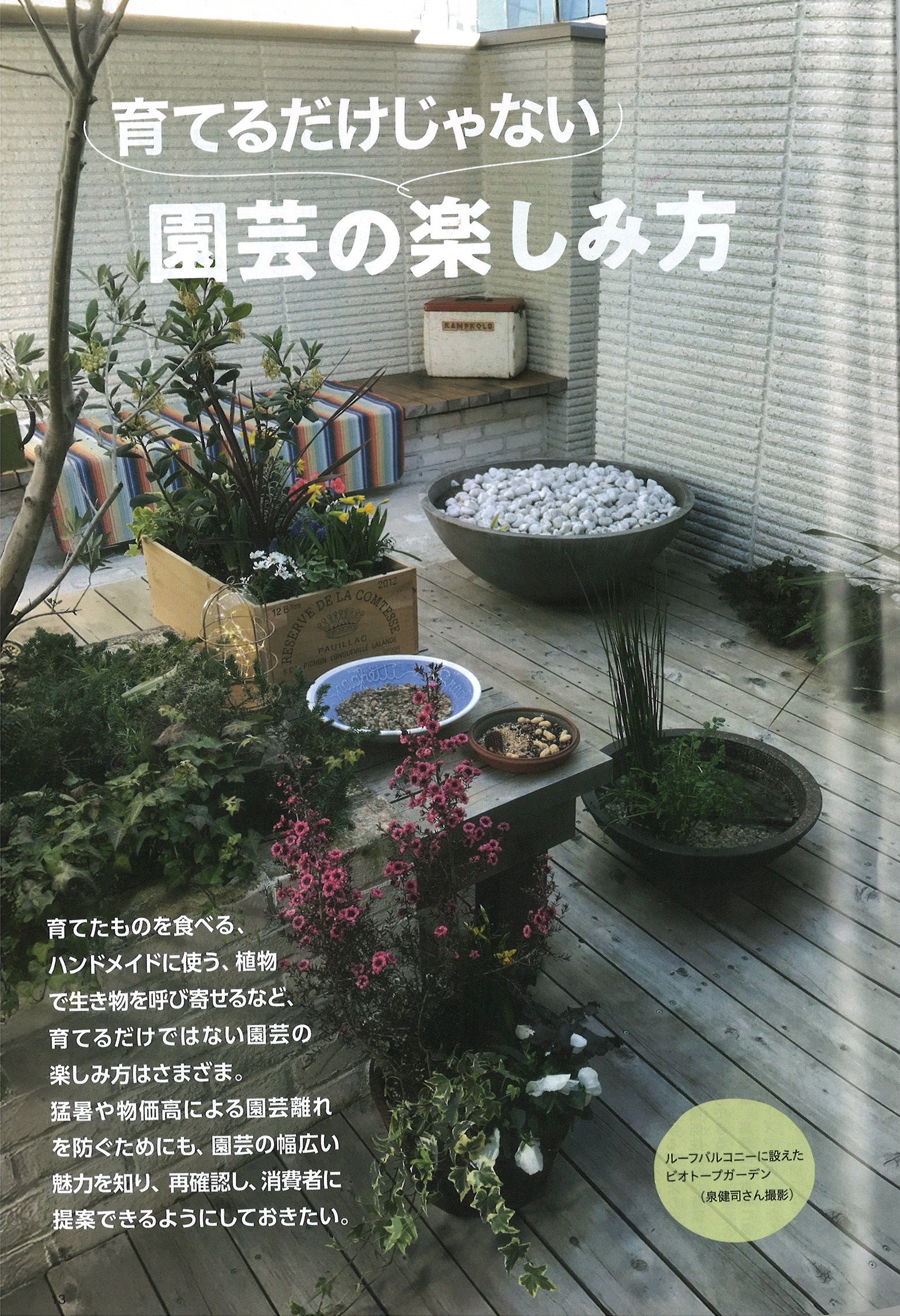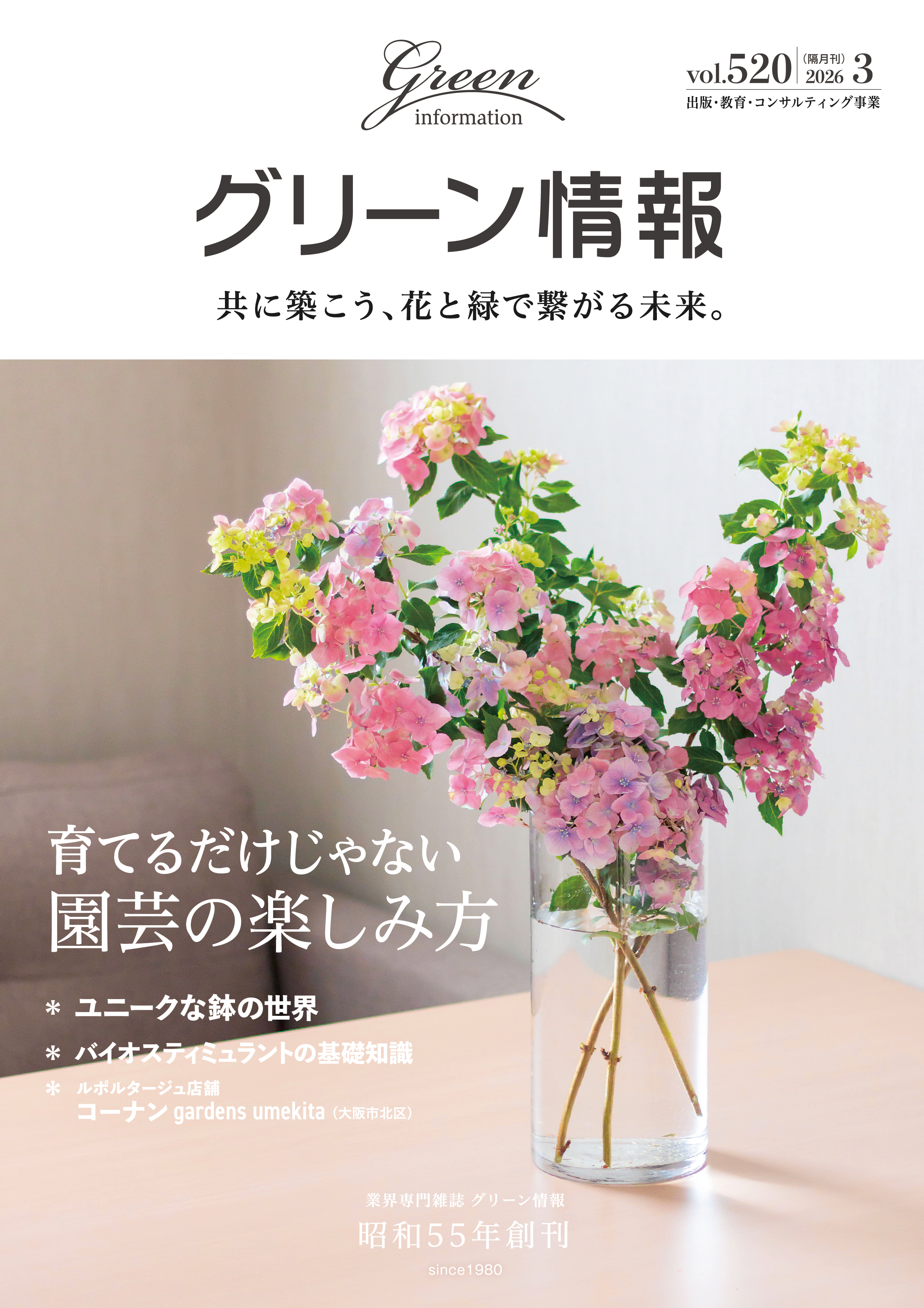 グリーン情報 3月 MAR 2026 Vol.520 CONTENTS ◎特集 13 育てるだけじゃない園芸の楽しみ方 14 食べる タキイ種苗 家庭菜園継続のコツは 自分好みの品種選び 16 食べる エスビー食品 高いブランド力を生かし ハーブ苗の需要拡大を目指す 18 飾る ハクサン 無理なく庭を2倍楽しむ Garden to vase 20 生き物に触れる 泉健司 豊かな実りを支える 身近な生き物たちとの暮らし 22 ハンドメイド 生活の木 植物を使ったものづくりが 人と人をつなぎ、日々を豊かに ーーーーーーーーーーーーーー ーーーーーーーーーーーーーー ◎特集 25 ユニークな鉢の世界 26 暮らしに寄り添う「onajimi」の顔 プランタン山田 28 よりどりみどりで胸弾むリトルレジンポット ケー・イー・アイ 30 3Dプリンターでアイデアを形に EPIX ーーーーーーーーーーーーーー ーーーーーーーーーーーーーー ◎ピックアップ 38 バイオスティミュラントの基礎知識 44 第3回東京パークガーデンアワードグランプリ受賞! 「多様性」と「レジリエント」で長く楽しめる、みんなのガーデン ーーーーーーーーーーーーーー ーーーーーーーーーーーーーー ◎アラカルト 6 KINCHO園芸の2026除草剤ラインナップ 8 Fukuoka Flower Show 2026 34 屋内緑化コンクール2026 募集中! 36 パナソニック ホームズ京都の挑戦 植栽で付加価値を提案 ーーーーーーーーーーーーーー ーーーーーーーーーーーーーー ◎トピックス 66 第108回大原ビックフェスティバル開催 68 グリーンインフラ産業展2026 開催 70 2026年ウエキ商談会 園芸専門店からの根強いニーズに応える 71 サカタフェア2026及び RODALGO(ロダルゴ)発表会を開催 72 植物と商いのわくわく市in富士山 生産者有志が開催 73 屋内緑化推進協議会 中国広東省の観葉植物生産などを視察 世界らん展2026 さまざまな香りに包まれた会場 74 岐阜花き流通センター農業協同組合 創立四十周年記念式典・祝賀会 75 日比谷花壇が花き業界初の「エコ・ファースト企業」に認定される ーーーーーーーーーーーーーー ーーーーーーーーーーーーーー ◎連載 32 GREEN×EXPO 2027 出展者紹介 48 園芸薬品のキホンと病害虫対策のコツ(4) 草間祐輔 50 ヒーリング時代の緑の使い方(54) 千葉大学大学院 岩崎 寛 54 問答形式で学ぶ園芸知識(26) 柴田忠裕 58 ただいま花咲く準備中!(12) 大塚青葉さん、村田琴香さん、清水桃子さん 62 名工チャレンジ(9) 小林 徹 64 IGCAをチャンスにするために(4) 2 ルポルタージュ店舗 gardens umekita(大阪市北区) 42 TPGAレター(17) 52 企業緑地 わが社のみどり自慢(11) 幸田サイト 56 ひろがる花のわ&花笑み(4) 中村万里子さん 60 企業を訪ねて(17) ネイチャーフィールド クロスワークス事業部(堺市堺区) ーーーーーーーーーーーーーー ーーーーーーーーーーーーーー ◎インフォメーション 77 ニュース 80 イベント情報 82 園芸関係統計資料 83 今月の市況 ーーーーーーーーーーーーーー